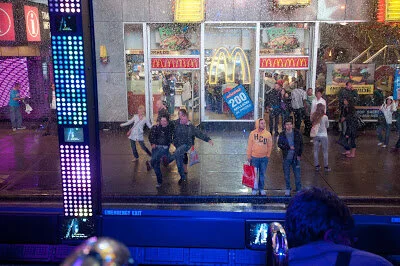 Even before the bus pulls away, a performance (which I won't spoil for you) takes place on the street, blurring the lines between the show and the tourist hyper-reality of Times Square. The performers, with the street as their stage, have to improv quite a bit, and are real troupers, because they did a great job on the show we saw, which took place during a severe-warned thunderstorm (we even had pea-sized hail on the Ride's ceiling windows!).