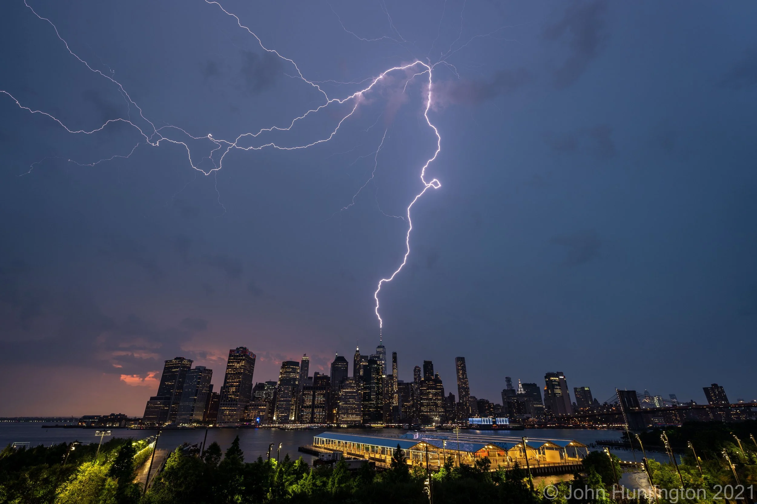 This photo is especially meaningful to me because of what I went through to get it. Out in the plains when chasing tornadoes we drive everywhere; if the storm path changes, we reposition. But here in NYC, repositioning is a challenge due to traffic and parking, and that means that once you commit to a location you often can't move if the storm goes elsewhere, and because of that, the handful of us city storm chasers (recent article in Curbed/NY Magazine here) have helplessly watched incredible storms drift off into the distance. Watching the forecast last July, the location I had in mind was the Brooklyn Heights Promenade. Parking there is very difficult, so I took a subway and then rode a Citibike with my cameras and tripod on my back. I got set up, and then as I stepped away from my tripod for a couple seconds, the gust front from the incoming storm blew over my heavy-duty tripod, smashing my Nikon z6 camera onto the promenade. Dejected, I switched the lens (which fortunately survived) to my second camera, and then waited through heavy rain and wind for lightning on the back side of the storm. And, there wasn't any. So, dejected, soaked to the skin and estimating the cost of camera repairs in my head, I packed up and started heading home. And then, boom! A strike. I quickly set up the tripod again, and--over the next hour--caught five more bolts, including this one. When shooting storms--and especially lightning--luck is always a factor, but you can make your own luck by being persistent.